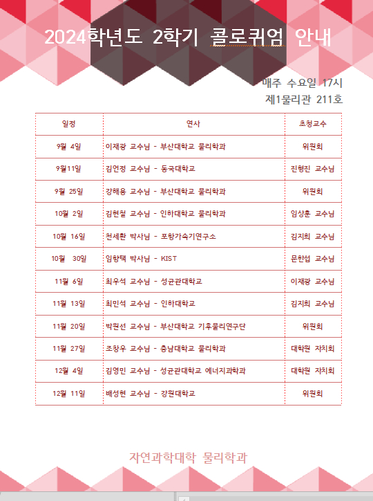 2024학년도 2학기 물리 콜로퀴엄 일정 안내