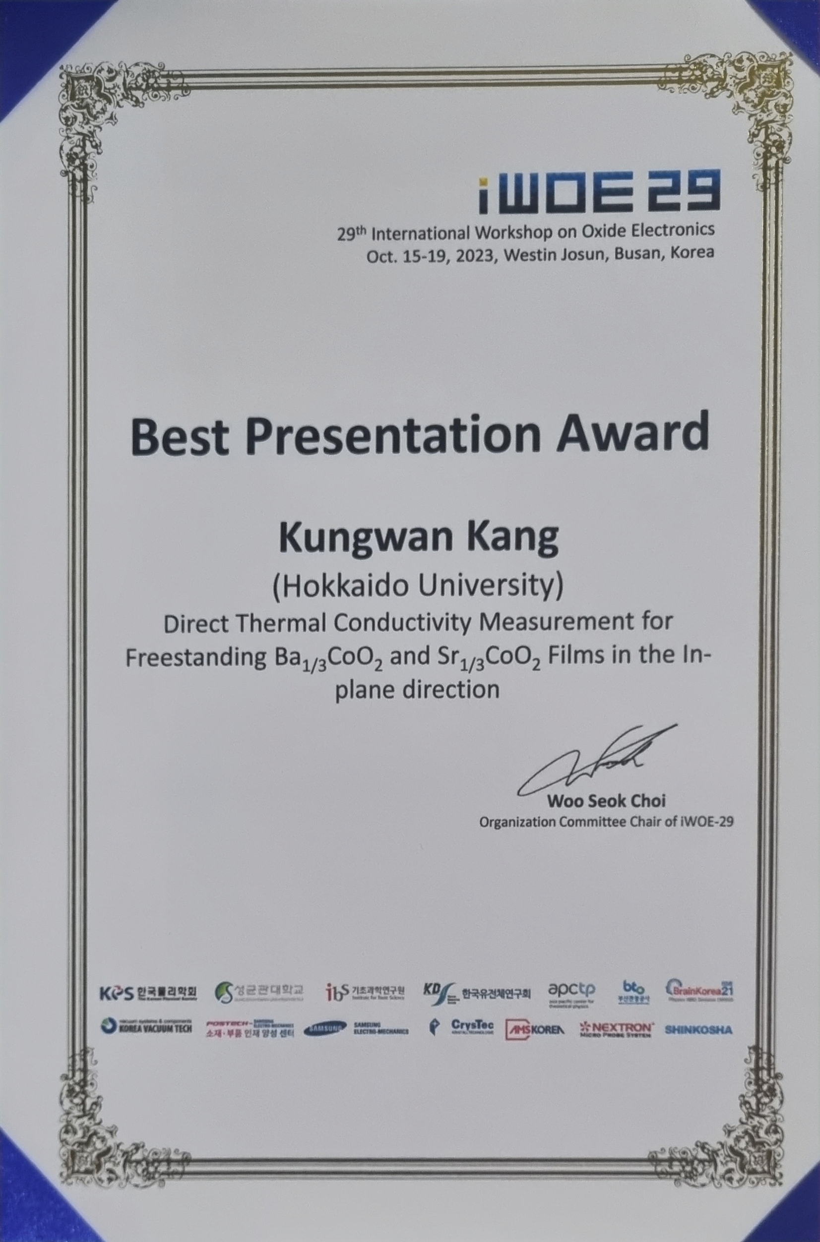강경완 졸업생, 고특성 산화물 열전소재 제작법 논문 발표 및 우수논문상 수상