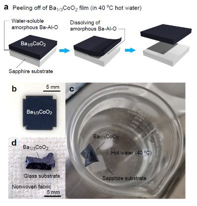 그림. (a) 자립형 Ba1/3CoO2 박막 제조 과정, (b) 에피텍셜 Ba1/3CoO2 박막(~600 nm 두께)의 사진 (c) 40 oC 박막에서 분리되어 박막이 물 표면에 떠 있는 모습. (d) 유리 기판으로 전사한 자립형 Ba1/3CoO2 박막